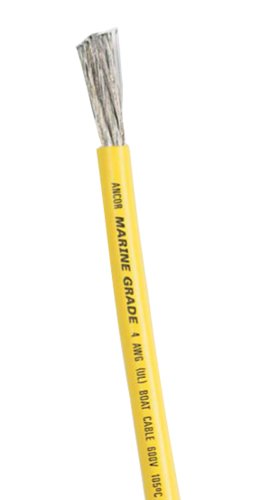 Ancor 113910 Marine Grade Electrical Tinned Copper Battery Cable (4-Gauge, Yellow, 100-Feet)?MARINE GRADE BATTERY CABLE is tinned copper stranding for maximum protection against corrosion, electrolysis and fatigue due to vibration and flexing. Rated at 600 volts and 105 degrees C, the heavy duty insulation is resistant to heat and abrasion. Exceeds all UL 1426, US Coast Guard Charter Boat and ABYC standards. Size: 4 Color: yellow Length' 100