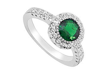 #A center-set brilliant-cut round frosted emerald is surrounded by smaller round CZs. Other round CZs are bezel-set on each side. Crafted in 10K white gold this ring has a total gem weight (TGW) of 2.50 carat.