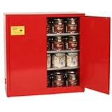 Eagle 1976-RED Safety Cabinet for Flammable Liquids, 2 Door Manual Close, 24 gallon, 44"Height, 43"Width, 12"Depth, Steel, RedThe Eagle 1976-RED wall-mount safety cabinet has two manually closing doors and three adjustable shelves, can be used to store safety cans containing up to 24 gallons of flammable liquids, and is 12 inches deep, making it suitable for use above a workbench. The cabinet is made of 18-gauge galvanized steel, which is resistant to rust, dents, and certain chemicals. Gauge is a measure of thickness (the lower the gauge, the thicker the material). The top, sides, doors, and bottom of the cabinet are double-walled, with 1-1/2 inches of space between the walls, to reduce the risk of fires. The red powder-coated finish resists scratches, chipping, fading, and other wear. Each shelf is supported by four brackets and can hold up to 350 pounds. The three-point key lock and button latch help keep the cabinet doors securely shut. The doors are attached to the cabinet with continuous piano hinges, which are more secure than typical butt hinges. The door sill is 2 inches high to help keep out moisture. Two 2-inch vents allow internal vapors to escape. Each vent has a fire baffle and cap to help prevent liquids inside the cabinet from igniting. A ground connection facilitates grounding and helps prevent static sparks. Four adjustable feet enable the cabinet to be leveled. A safety warning label in English, French, and Spanish alerts users to the cabinet's contents. The cabinet measures 44 x 43 x 12 inches (H x W x D), weighs 214 pounds, and can store up to 24 gallons of flammable liquids. (H is height, the vertical distance from lowest to highest point; W is width, the horizontal distance from left to right; D is depth, the horizontal distance from front to back.) It meets Occupational Safety and Health Administration (OSHA) Standard 1910.106 and National Fire Protection Association (NFPA) Code 30 for the safe storage and handling of flammable liquids. Hazardous storage cabinets are used to store, organize, and segregate safety cans containing flammable or hazardous liquids. Some cabinets are made of galvanized steel and are double-walled to reduce the risk of fires. Others are made of polyethylene, which is resistant to certain acids and corrosive liquids. Cabinets may have standard hinged doors that close manually or self-closing hinged or sliding doors that close automatically. They can be color-coded: yellow for flammables; red for combustibles; blue for corrosives; green for pesticides; silver or light neutral for laboratory materials; and white or gray for other waste or outdoor lockers. Certain cabinets are FM Approved and meet National Fire Protection Association (NFPA) and Occupational Safety and Health Administration (OSHA) standards for the storage and handling of flammable liquids. Hazardous storage cabinets are used in a variety of commercial and industrial environments and can also be suitable for home use. Eagle Manufacturing Company manufactures industrial safety, haz-mat, and storage products that meet International Organization for Standardization (ISO) standards for quality assurance. The company, founded in 1894, is headquartered in Wellsburg, VA.