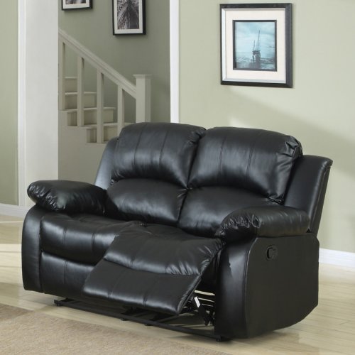 FeaturesCranley CollectionBlack Bonded Leather MatchModern StyleRelease mechanism that with a gentle pullTufted bonded leather covers the overstuffed arms, seats and backs Cranley Reclining Loveseat Color: Black?